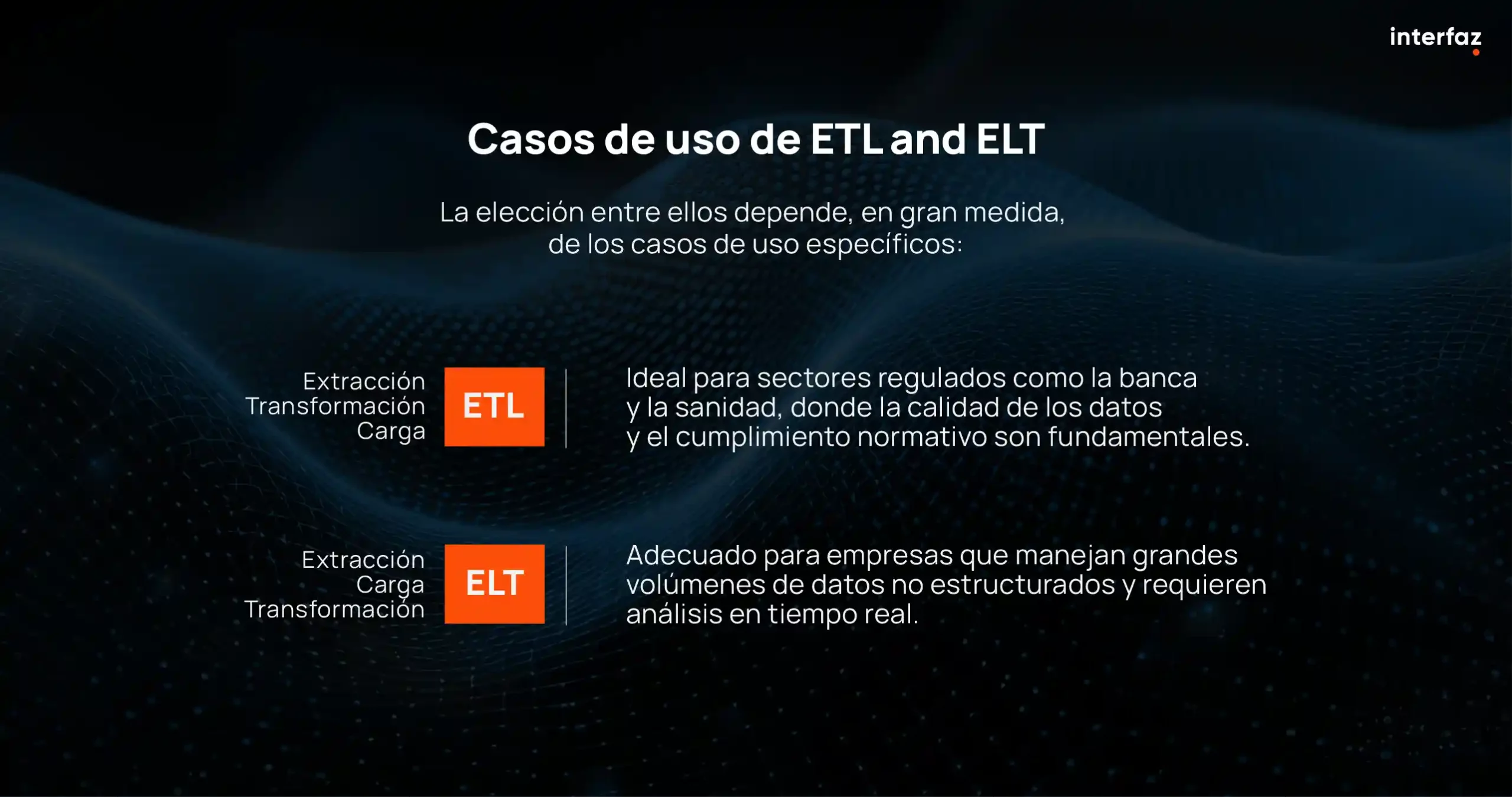 La elección entre ETL y ELT depende significativamente de casos de uso específicos:
