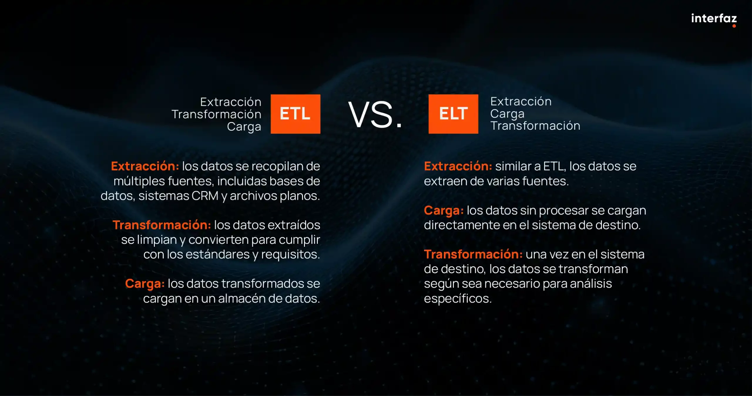- Secuencia de procesamiento: en ETL, los datos se transforman antes de cargarse en el sistema de destino, mientras que en ELT, la transformación ocurre después de la carga.