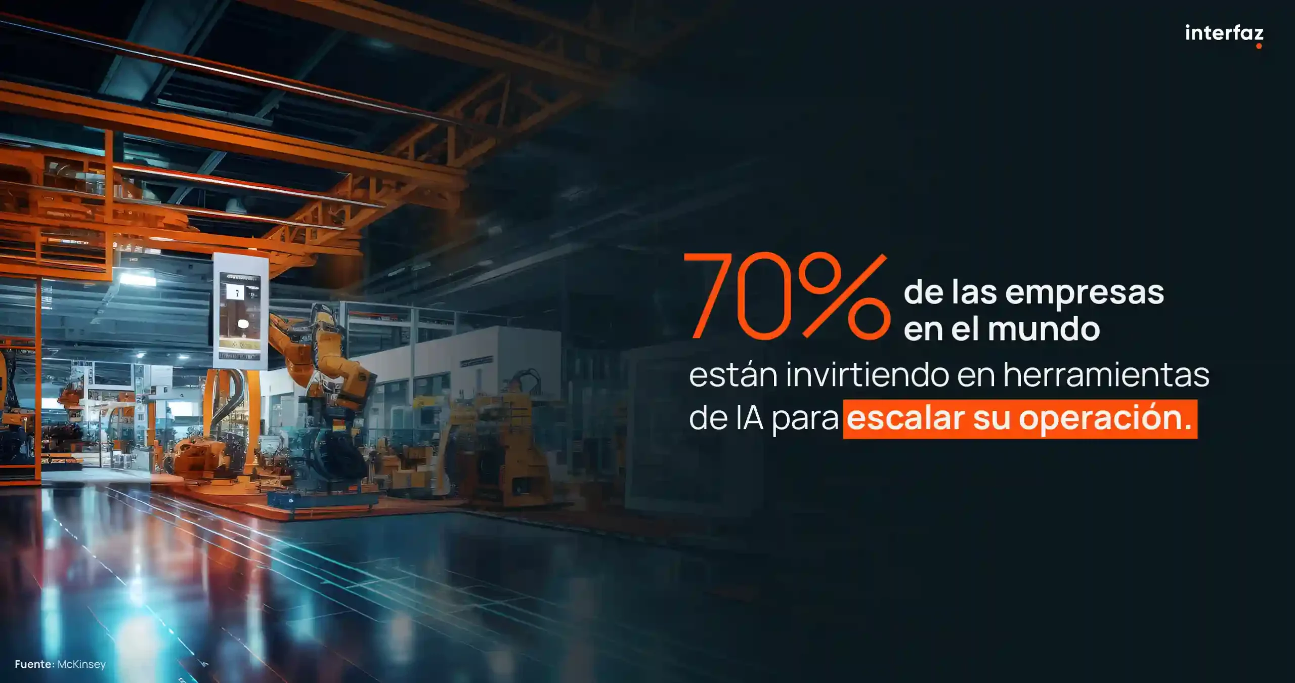 Según McKinsey, alrededor del 70% de las empresas a nivel mundial están invirtiendo en algún tipo de IA para escalar sus operaciones.