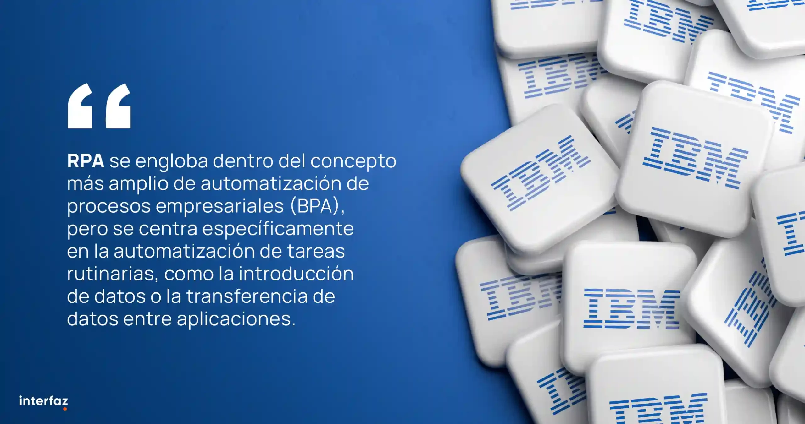 Como explica IBM, «la RPA se encuentra dentro del ámbito más amplio de la automatización de procesos de negocio (BPA), pero se centra específicamente en automatizar tareas rutinarias como la entrada de datos o la transferencia de datos entre aplicaciones».